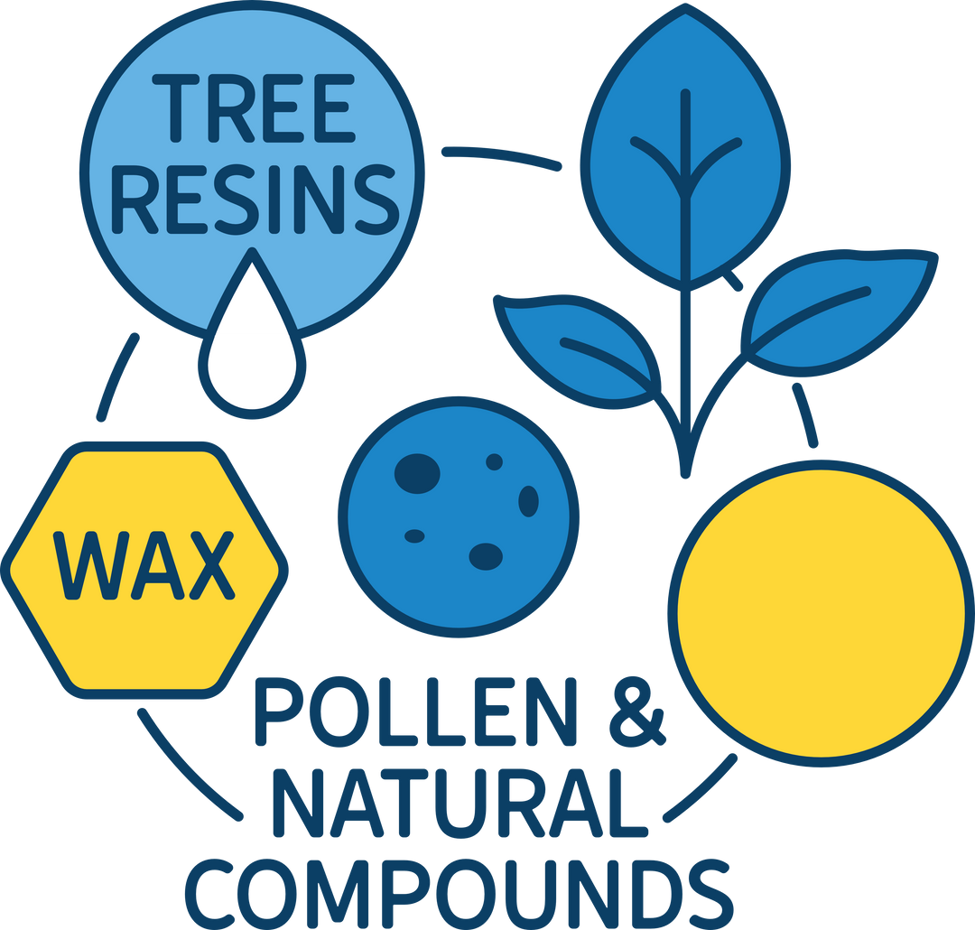 Sticky, strong, and full of natural resilience, it’s what they use to patch cracks, seal out intruders, and purify the hive. It’s tough, antimicrobial by nature, and rich in the good stuff – flavonoids, resins and plant compounds.
